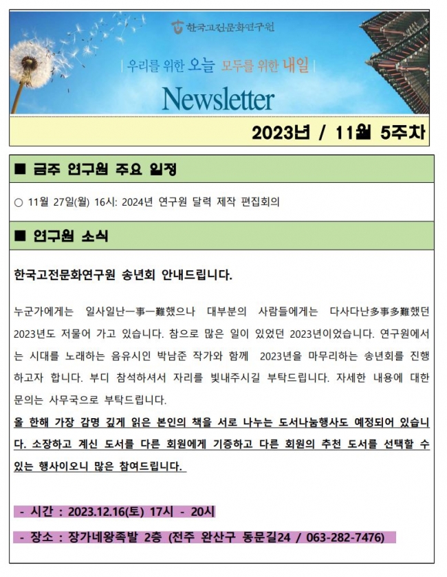 한국고전문화연구원 주간 뉴스레터(2023년 11월 5주차)