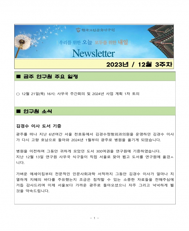 한국고전문화연구원 주간 뉴스레터(2023년 12월 3주차)